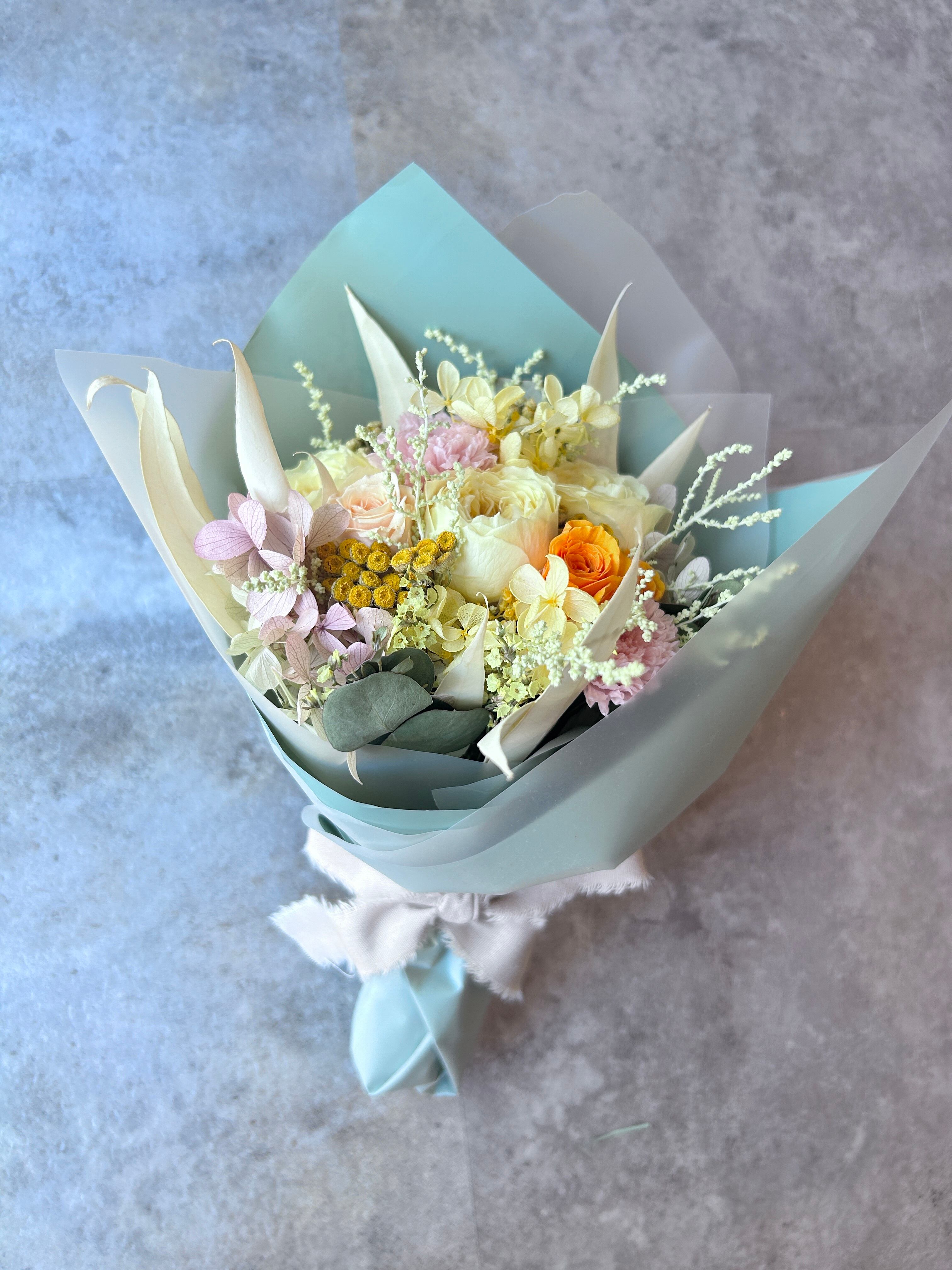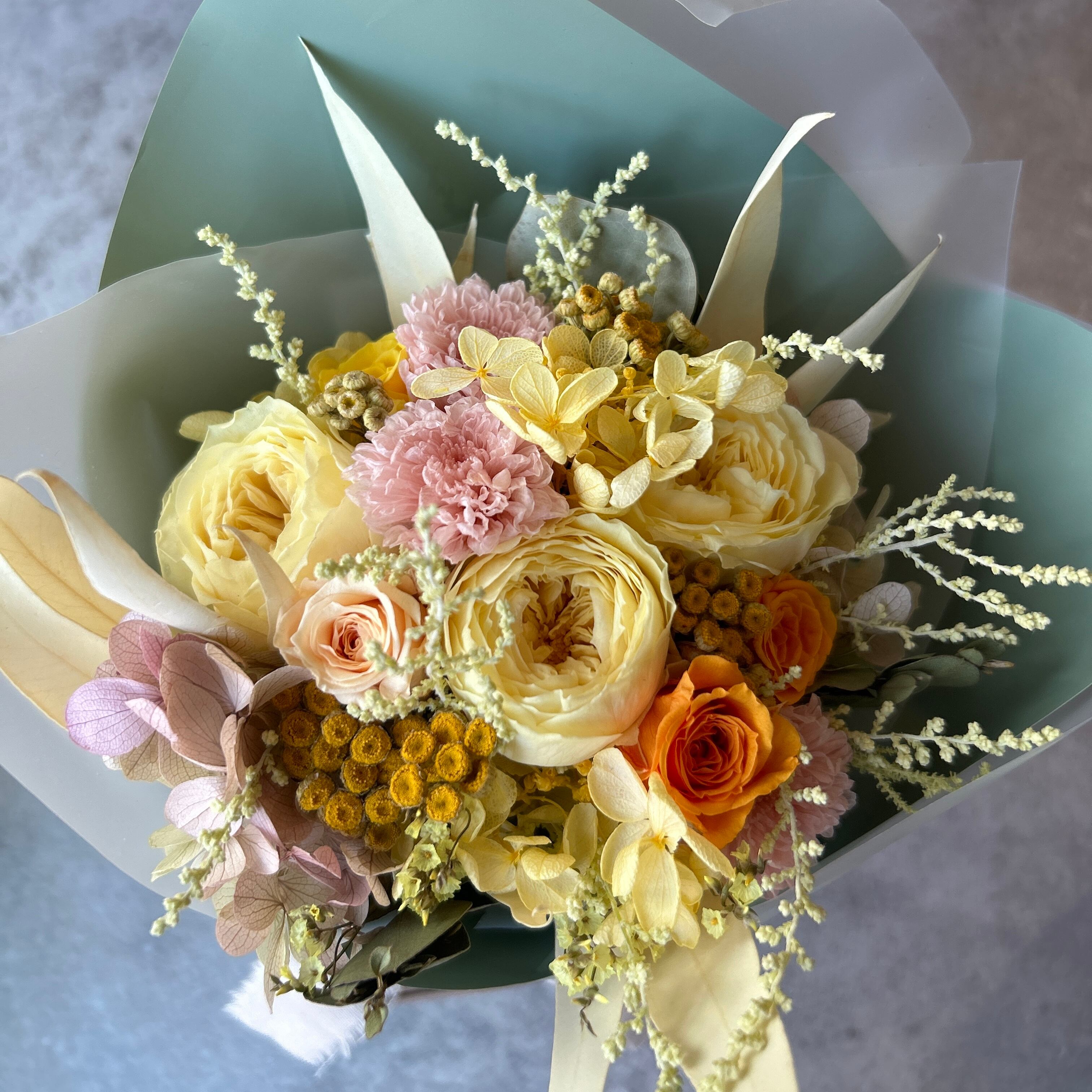 たくさんのプリザーブドフラワーのバラやアジサイ、ドライフラワーの小花やグリーンを束ねたお花たっぷりの花束です。